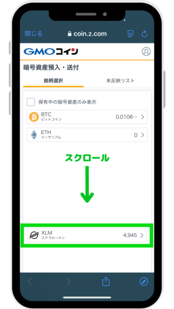 画面が切り替わったら、下にスクロールしていき、暗号資産を選択にて暗号資産の選択項目をタップします。