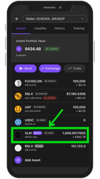 ウォレット画面に切り替わったら、「XLM」をタップします。