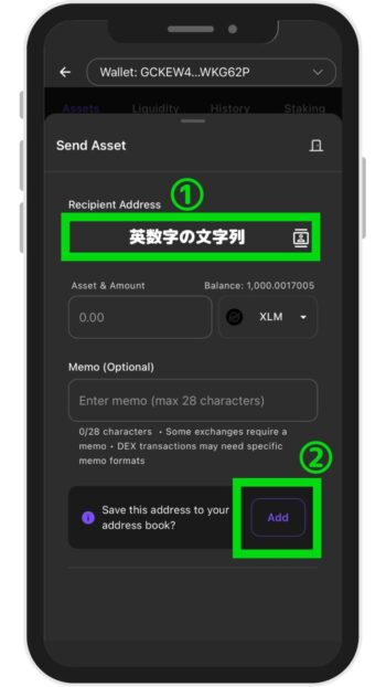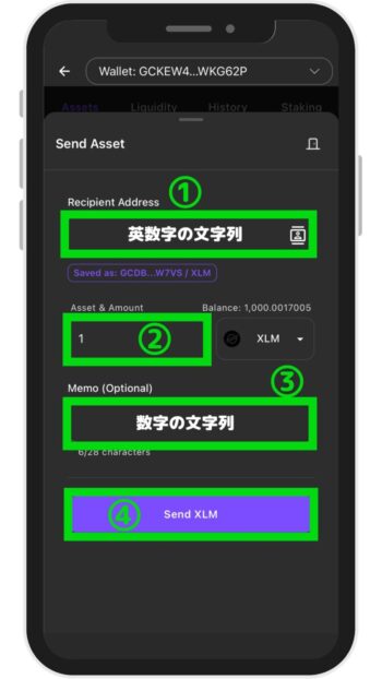 ※初めての送金の場合、テスト送金を推奨 - メモ:「XLMのメモ」を入力