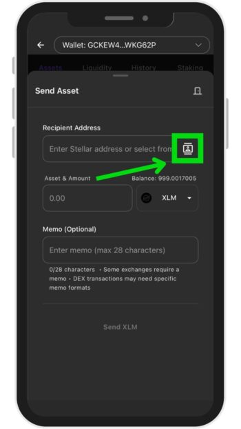 上記画面(Send Asset)が表示されたら「アドレス帳アイコン」をタップします。