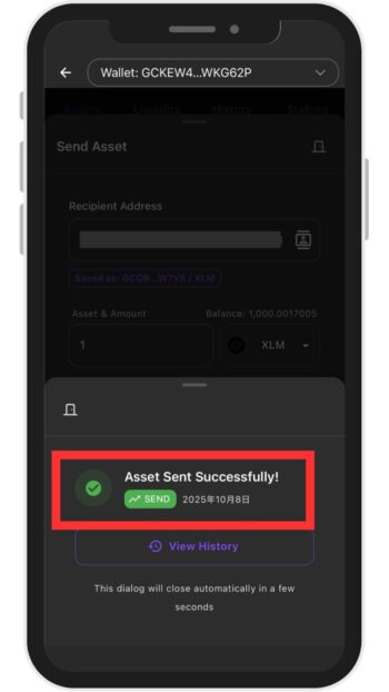 ※先程確認したMEXCの[メモ/タグ]識別子(数字の文字列) - 「Send XLM」ボタンをタップ