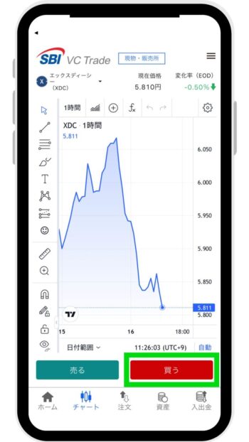 XDCのチャート画面が表示されたら、画面右下「買う」をタップします。
