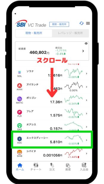 SBI VCトレードアプリでログインしたら、上記画面が表示されるため、画面を下にスクロールして「XDC」の項目をタップします。