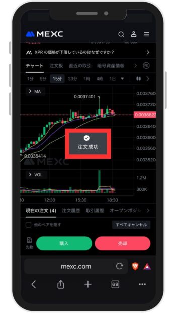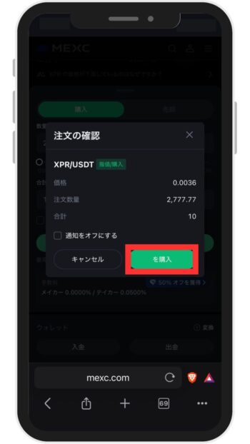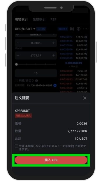 注文確認画面に切り替わったら、注文内容を確認し「購入 XPR」をタップします。