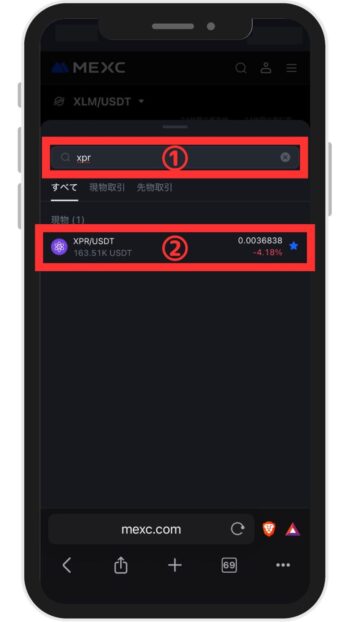 - 検索結果に表示された「XPR / USDT」(現物)を選択