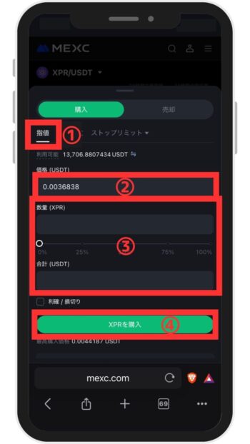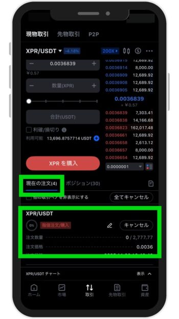 ※成行で購入したい方は「成行注文」をタップ - 「XPR / USDTの価格レート」を指定