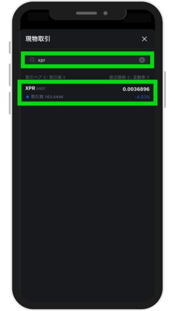 現物取引の検索画面に切り替わったら、画面上部の検索バーに「XPR」と入力し、検索結果に表示された『XPR / USDT』をタップします。