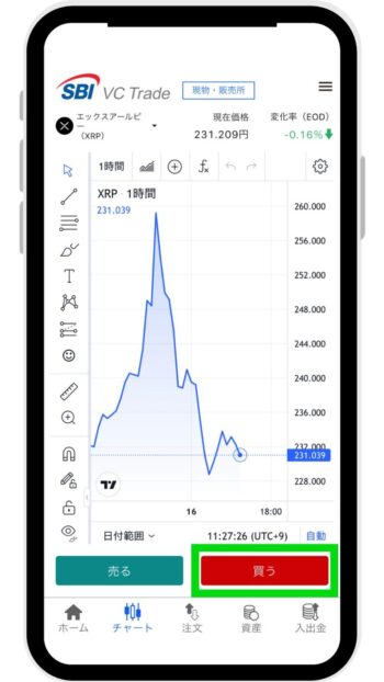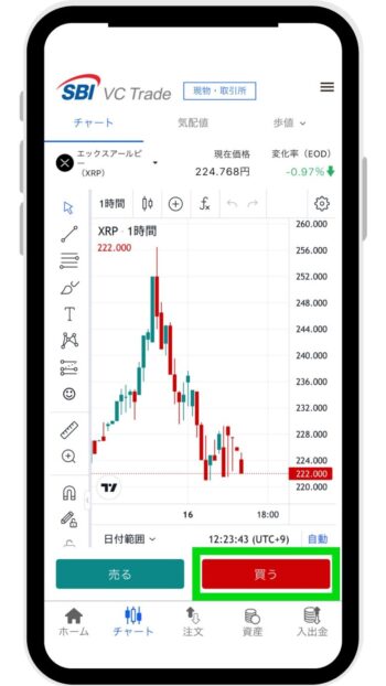 XRPのチャート画面が表示されたら、画面右下「買う」をタップします。