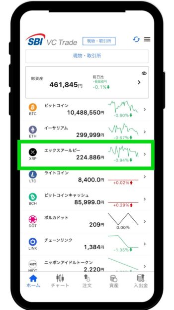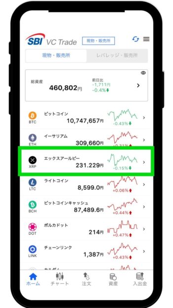 SBI VCトレードアプリでログインしたら、上記画面が表示されるため「XRP」の項目をタップします。