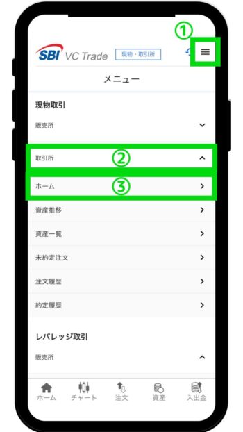 - 「取引所」>「ホーム」をタップ