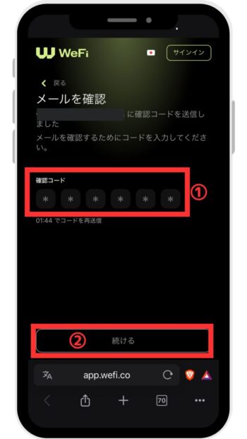 - 先ほど入力したメールアドレス宛に届いた「認証コード」を入力