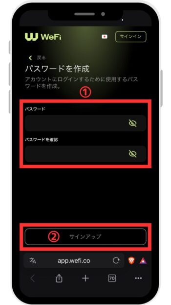 パスワード作成画面に切り替わったら、以下の手順で進めていきます。