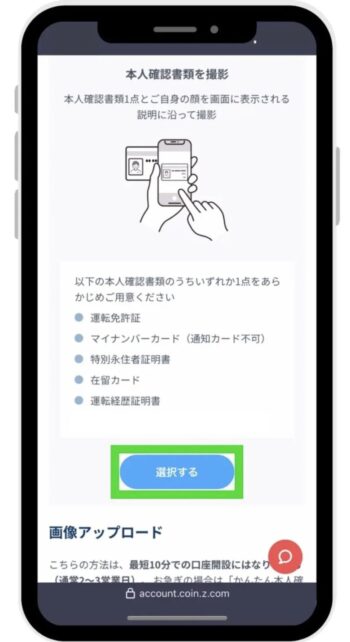 本人確認書類の撮影画面が表示されたら「選択する」をタップします。