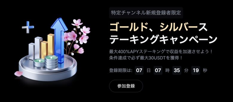 新規ユーザの方は、新規登録 & KYC(本人確認)と入金が完了するだけで30 USDT(約4,500円)がもらえるのは有り難いですね。