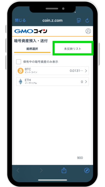 「暗号資産預入・送付」画面に切り替わったら、画面右上「未反映リスト」タブをタップします。